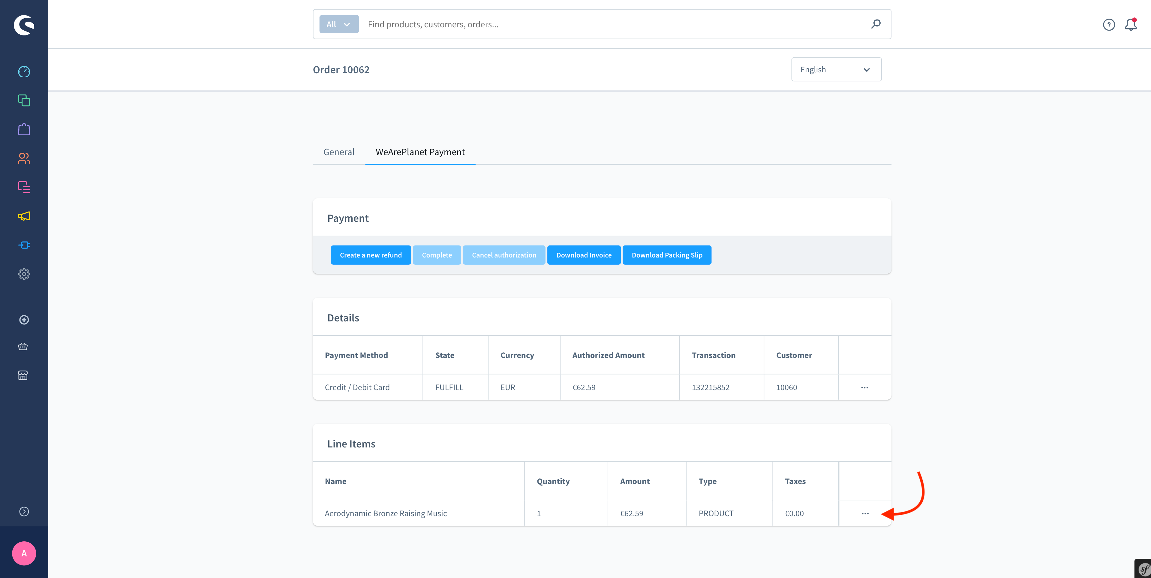 You can capture, cancel and refund transactions directly from within the Shopware backend. Please note if you refund, void or capture transactions inside WeArePlanet the events will be synchronized into Shopware. However, there are some limitations (see below).